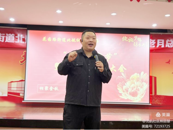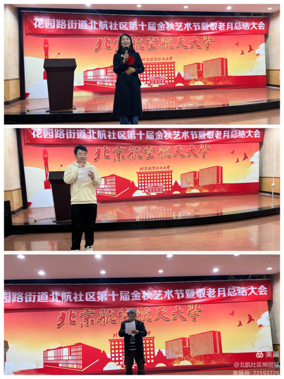金秋如画,岁月鎏金。10月29日,北航社区金秋艺术节暨敬老月总结大会在思源楼多功能厅举行。北航社区办副主任兼社区党委书记田原,居委会主任刘同华,业委会主任常军勤,社区物业刘阳、贾广保经理,以及社区居干、楼门洞长、志愿者和居民代表近两百人齐聚一堂,共同见证这一温馨时刻。大会由社区服务站站长张萌、社区党委副书记艾雪红、居干张帆共同主持。