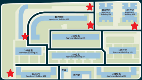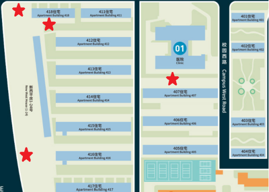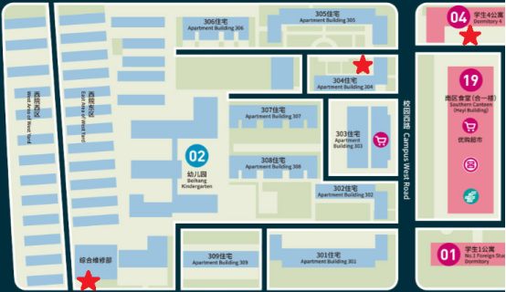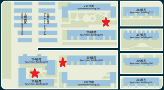 203、204楼中间(距离北院平房区南段、西院平房区北段较近)